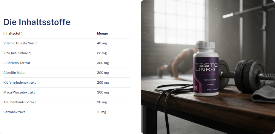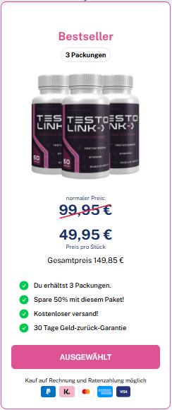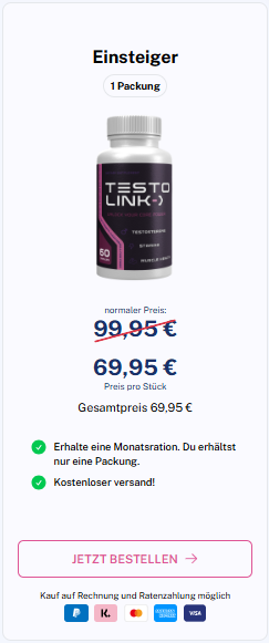 Nehmen Sie täglich zwei Kapseln von TestoLink ein. TestoLink wurde speziell entwickelt, um Ihren männlichen Körper zu unterstützen. Die kombinierte Einnahme der enthaltenen Inhaltsstoffe ist äusserst beliebt.